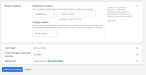 Step 4: Fill out the form with all the necessary information. (For phone calls I usually select one for “how many conversionions to count per click or interaction” because sometimes people will call multiple times.)